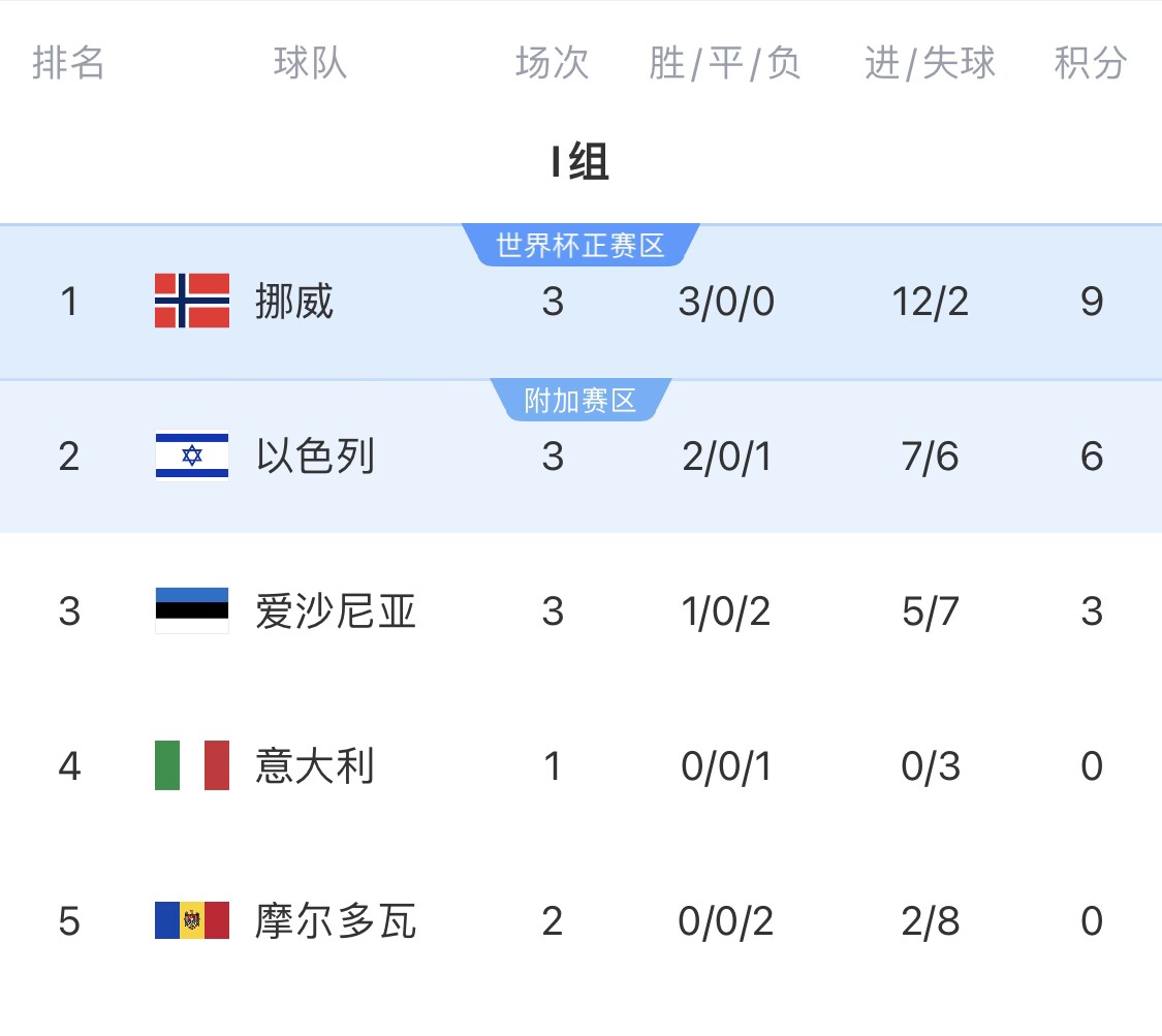 目前挪威3战全胜领跑欧洲I组,小组第一直通的概率为77%,小组前二的概率为99.7%,晋级世界杯的综合概率为84.1%。